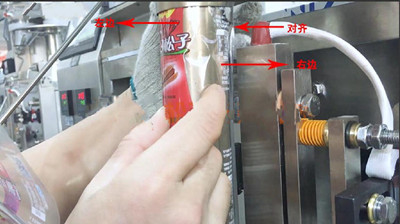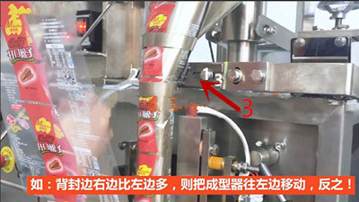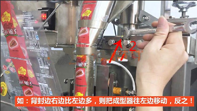 1)包裝膜安裝好后,開機(jī)測試,包裝膜制袋后,出現(xiàn)如下圖包裝袋背面封口左邊袋子邊比右邊袋子邊短小的情況。接下來根據(jù)包裝膜拉膜跑偏的情況調(diào)節(jié)包裝機(jī)的成型器。