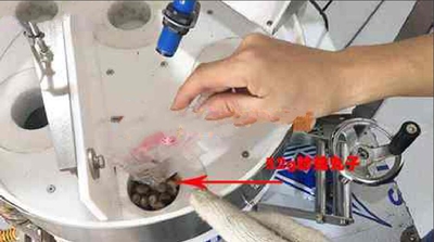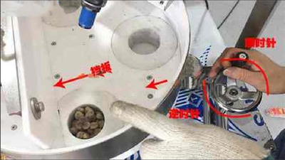 2、然后把52g的珍珠丸子倒入萬(wàn)能杯中,把手弄平杯中的珍珠丸子抹平,如果52g珍珠丸子溢出的話,需要把顆粒包裝機(jī)量杯計(jì)量裝置上的手柄往順時(shí)針?lè)较蚺?dòng),扭動(dòng)至物料與萬(wàn)能量杯平齊,如果52g珍珠丸子低于萬(wàn)能量杯,那么把量杯計(jì)量裝置上的手柄往逆時(shí)針?lè)较蚺?dòng)。調(diào)節(jié)好后,量杯計(jì)量裝置在旋轉(zhuǎn)的時(shí)候物料經(jīng)過(guò)擋板的時(shí)候,沒(méi)有卡料就證明調(diào)節(jié)好了。如下圖